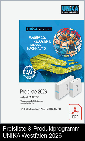 Fachinformationen / Preislisten UNIKA KALKSANDSTEIN Planungshandbuch KALKSANDSTEIN Nachhaltigkeit Wirtschaftlichkeit und serielles Bauen Bemessung und Konstruktion Schallschutz Wärmeschutz Brandschutz Ausführung Ausschreibungstexte (Vorschläge) 2024 Allgemeine Vorbemerkungen UNIKA KS 2024 UNIKA ecobluu KS XL-RE 2024 UNIKA KS Bauplatten 2024 UNIKA KS Kleinformate 2024 UNIKA KS Plansteine 2024 UNIKA KS XL-PE 2024 UNIKA KS XL-RE PREISLISTEN